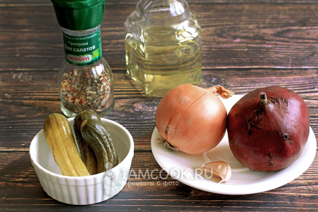Чтобы приготовить салат из жареной свеклы с луком и огурцами, возьмите все по списку ингредиентов.
