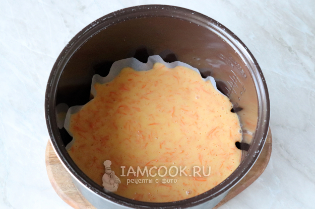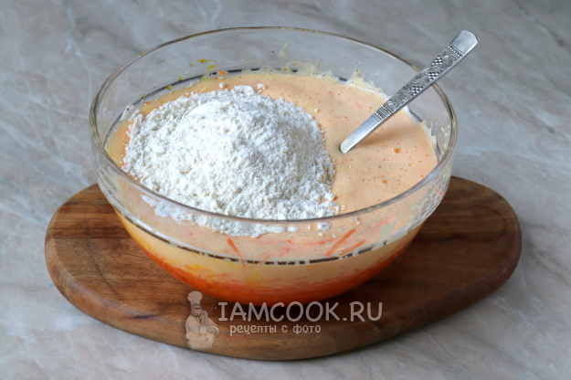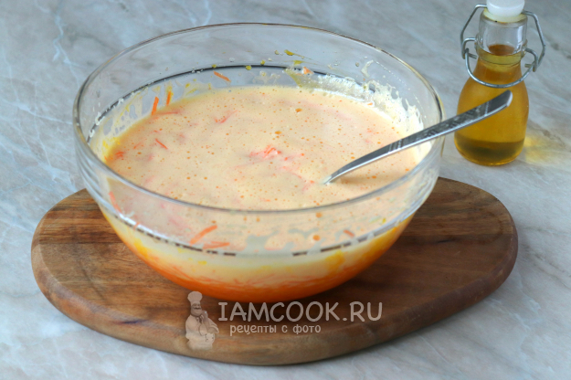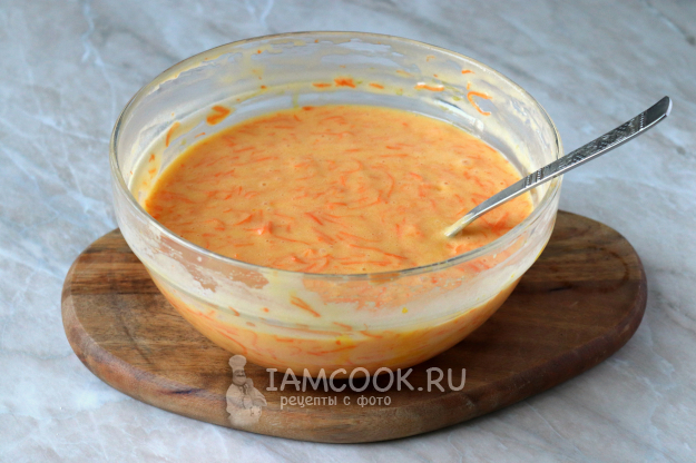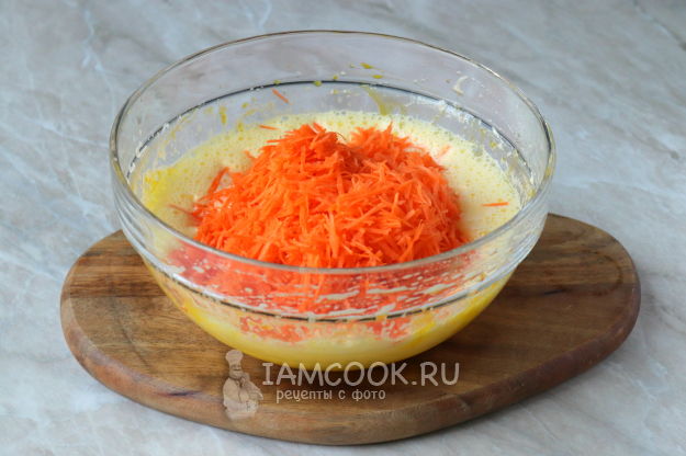 Очистить и натереть морковь на тёрке со средними ячейками. После чего морковную стружку добавить в миску с яично-сахарной массой.