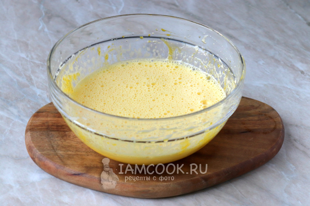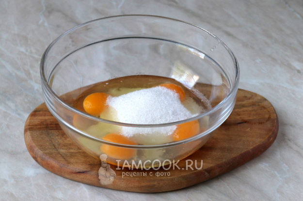 Куриные яйца вбить в глубокую сухую миску и добавить сахарный песок.
