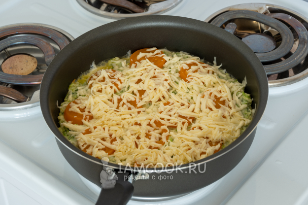 Затем снимите крышку, посыпьте всё тёртым сыром и пожарьте запеканку из кабачков с сыром на сковороде под крышкой ещё минуток 5 или даже меньше.