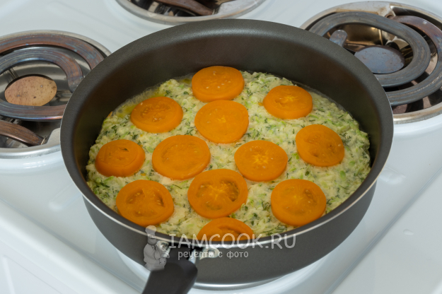 Сверху уложите кружочки помидорок. Накройте сковороду крышкой и жарьте на медленном огне 15-20 минут.