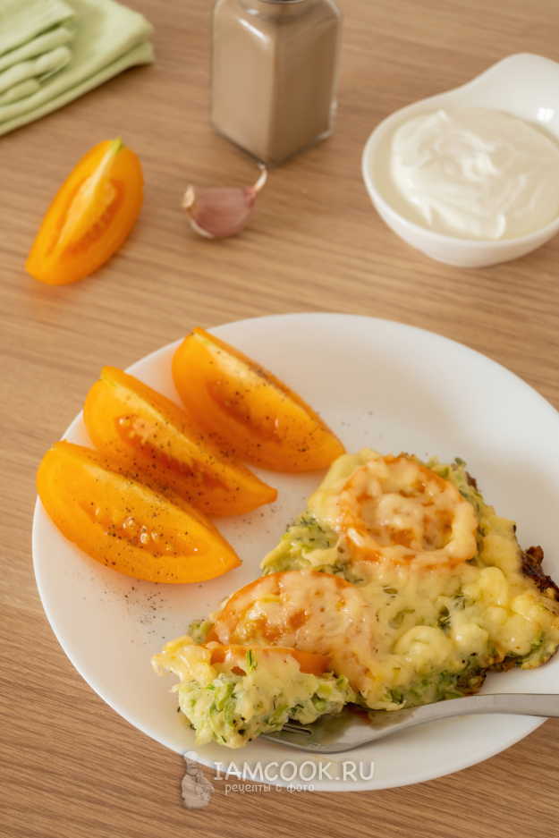 Кабачковая запеканка с сыром готова! Дождитесь, пока запеканка немного остынет и стабилизируется, тогда она не будет разваливаться. Подавать запеканку можно со сметаной и свежими овощами. Нам так очень нравится.