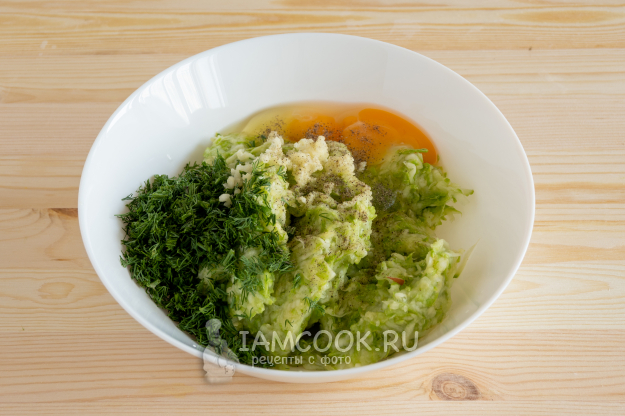Вбейте к кабачкам яйца. Положите укроп, выдавите чеснокодавкой чеснок и поперчите по вкусу. А теперь все эти компоненты перемешайте.