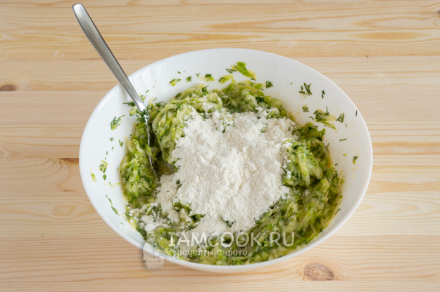 Всыпьте муку (лучше всыпать понемногу) и хорошенько размешайте овощную массу. У меня ушло 50 г муки.