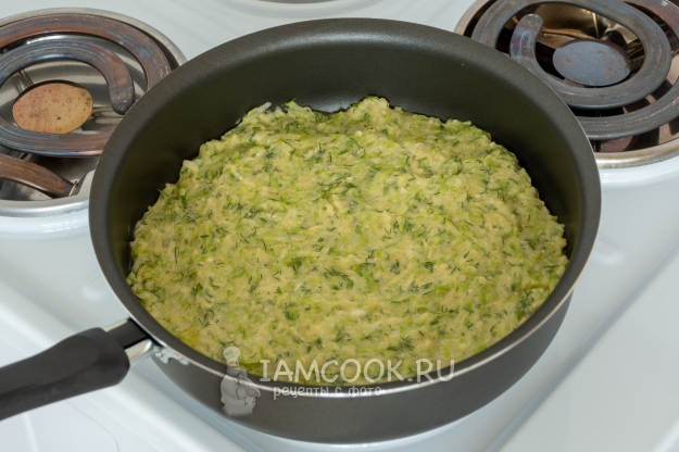 На разогретую сковороду налейте масло и выложите всю овощную массу, равномерно распределив её по сковороде.