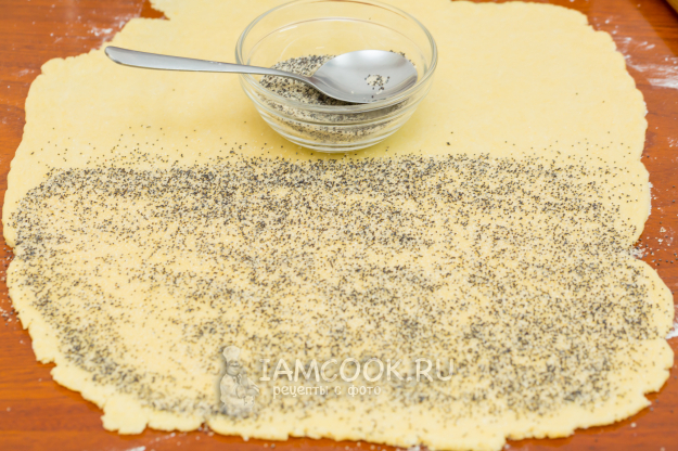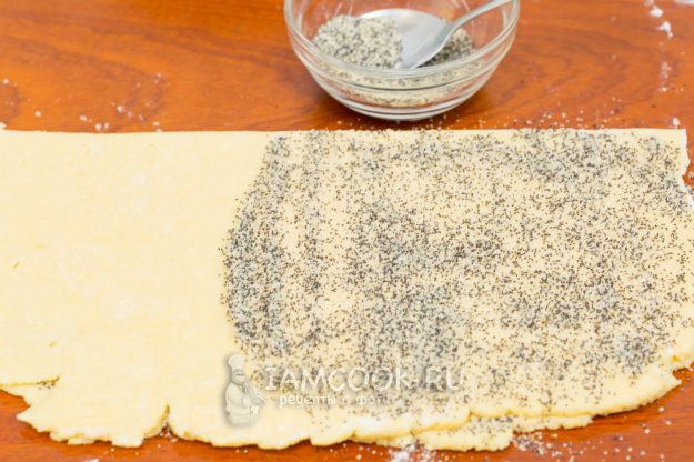 Накройте второй (той, на которой нет мака с сахаром) частью теста и нанесите оставшуюся смесь из сахара и мака.