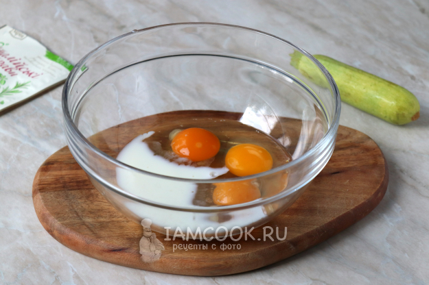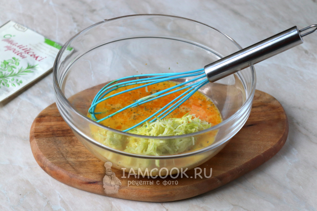 Кабачок помойте под холодной проточной водой, обсушите и обрежьте хвостики. После чего натрите его на тёрке со средними ячейками. Отожмите лишнюю жидкость, а кабачковую стружку добавьте в яично-молочную смесь.