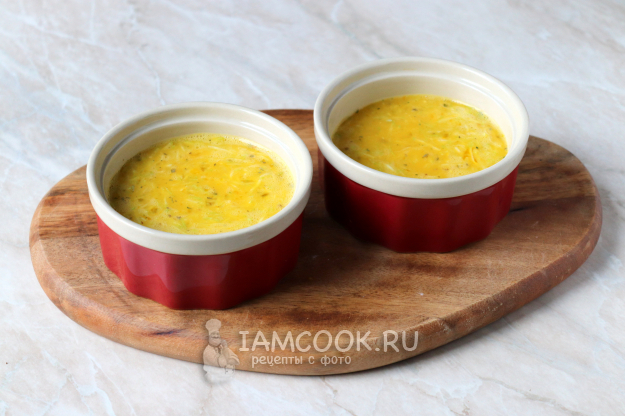 Снова перемешайте и разлейте её по порционным формочкам, подходящим для использования в микроволновой печи. Формочки заполняйте не до самого верха, а наполовину или на 3/4 объема, учитывая что омлет будет подыматься во время выпекания.