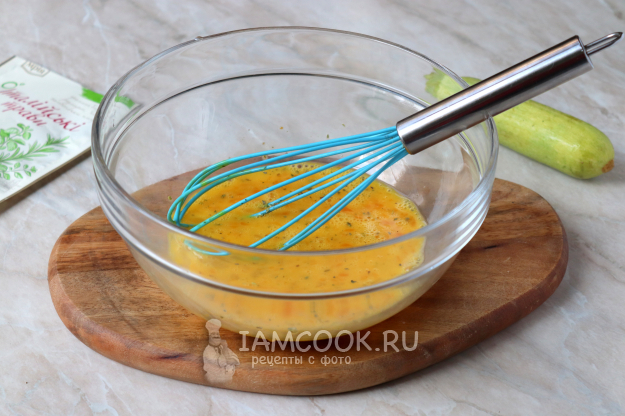 Яйца разбейте в глубокую ёмкость, добавьте молоко, щепотку соли и итальянские травы.