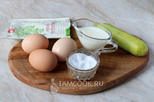 Возьмите все необходимые продукты для приготовления омлета с кабачками в микроволновке.