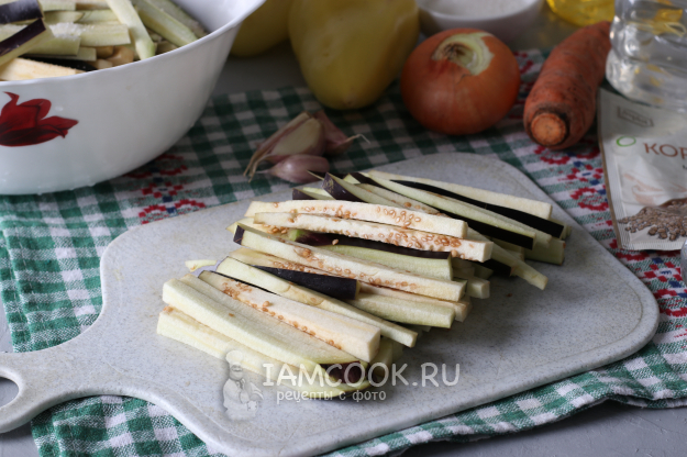 У баклажанов обрезать хвостики, мякоть нарезать полосками 10-12 мм, толщиной 6-7 мм. Сложить баклажаны в миску, добавить 1.5 ч.л. соли и перемешать, оставить на 20 минут.