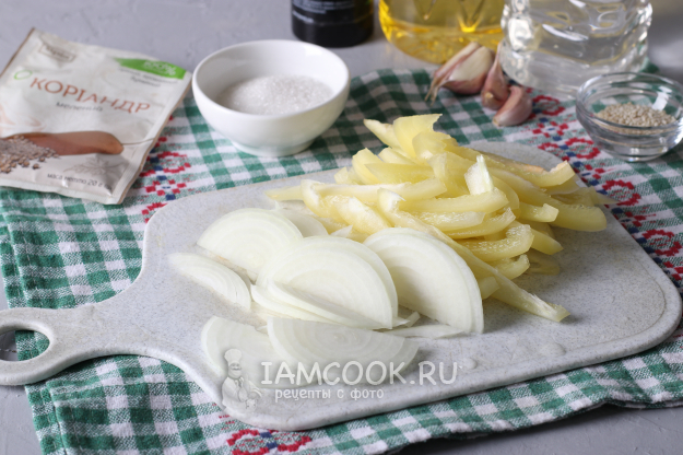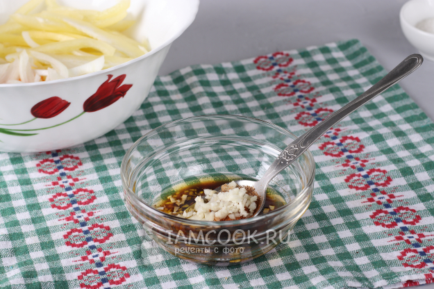 Для заправки смешать растительное масло, соевый соус, уксус, сахар, молотый перец, кориандр и измельчённый чеснок.