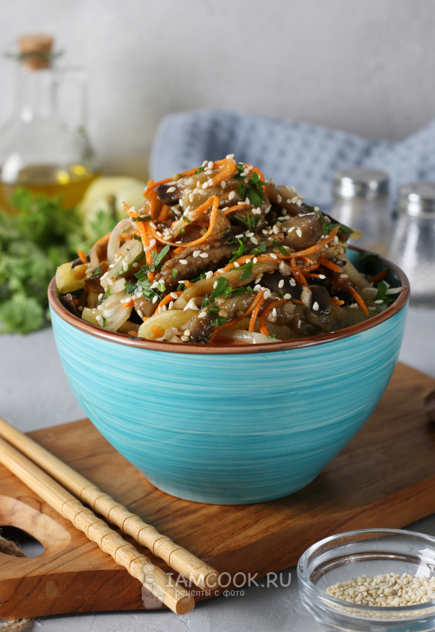 На сухой сковороде поджарить кунжут, измельчить зелень. Перед подачей зелень добавить в салат и перемешать. Поместить салат из баклажанов по-корейски в удобную пиалу, посыпать кунжутом и подать к столу.