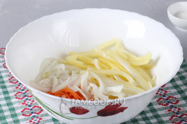 Морковь натереть на тёрке для корейских салатов, сложить в миску, добавить туда сладкий перец и лук.