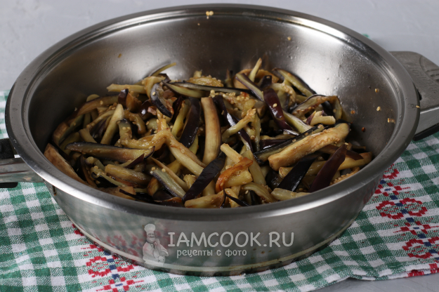 Баклажаны промыть водой от соли и обсушить. Разогреть в сковороде масло и жарить баклажаны 5-7 минут до золотистой корочки, но не пережаривать.