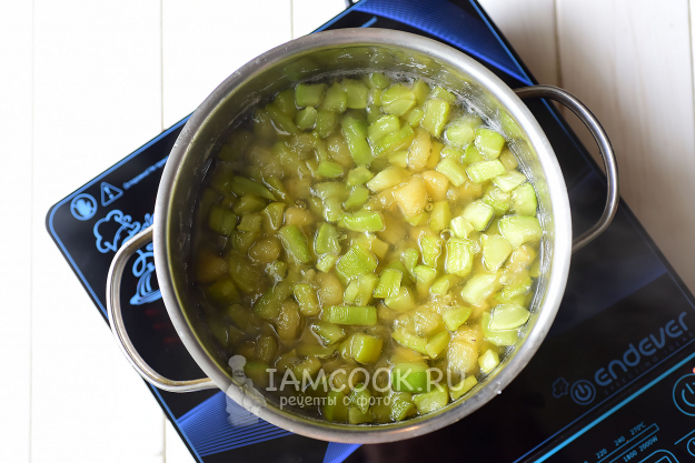 Кастрюлю с кабачками и бананом поставим на плиту, включим минимальный нагрев, будем варить варенье 40 минут, регулярно помешивая деревянной ложкой.