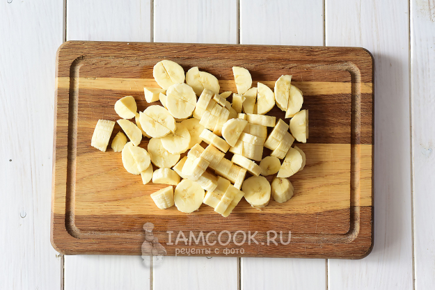 Снимем с бананов кожуру и нарежем на кусочки по размеру примерно соизмеримые кубикам кабачков.