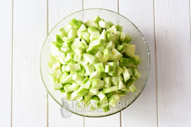 Снимем с кабачка кожуру, удалим семенной отдел, нарежем на кубики со стороной размером не более 1,5 см.