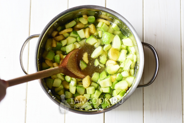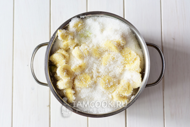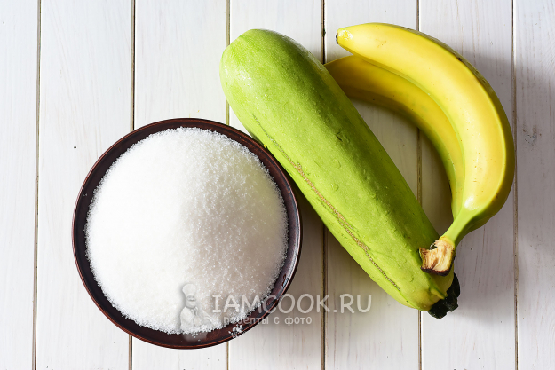В кастрюлю с толстым дном выложим кабачки и бананы, добавим весь сахар, немного перемешаем, оставим на 2 часа.