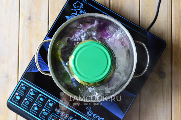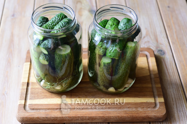 Маринадом зальем огурцы в банках. Банки прикроем крышками, поставим на дно кастрюли (дно предварительно застелем кухонным полотенцем), зальем воду в кастрюлю как можно выше по уровню, включим средний нагрев, дождемся, когда жидкость закипит, после чего будем стерилизовать банки с огурцами 15 минут в активно кипящей воде.