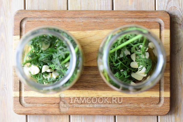 На дно стерилизованных банок, равномерно распределяя, выложим веточки морковной ботвы, произвольными кусочками нарежем дольки чеснока, разложим по банкам перец горошком.