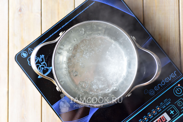 Приготовим маринад. В кастрюлю зальем воду, поставим на плиту, включим максимальный нагрев, добавим в воду соль, сахар. Дождемся, когда вода закипит, добавим уксус, выключим огонь.