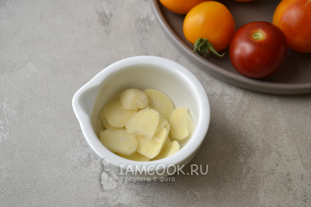 Чеснок нарежьте тонкими слайсами, положите в ступку.