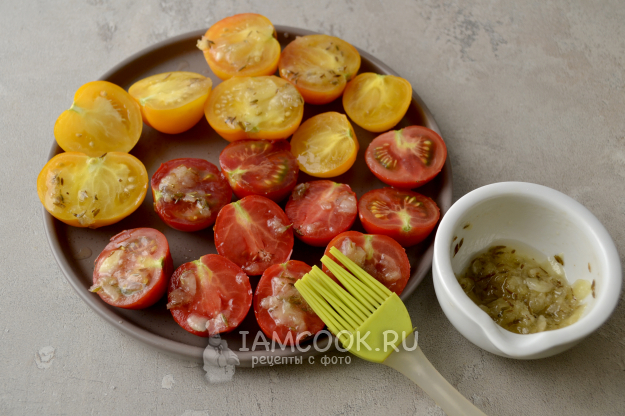 Смажьте помидоры ароматным маслом при помощи силиконовой кисточки.