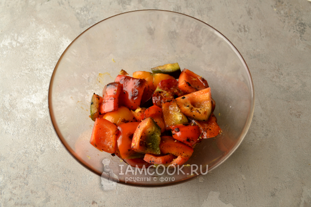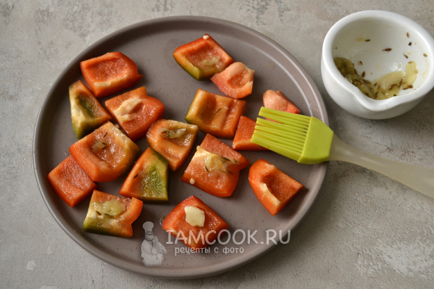Сладкий перец вымойте, разрежьте, удалите семена. Нарежьте перец на небольшие кусочки. Смажьте поверхность перца ароматным маслом.