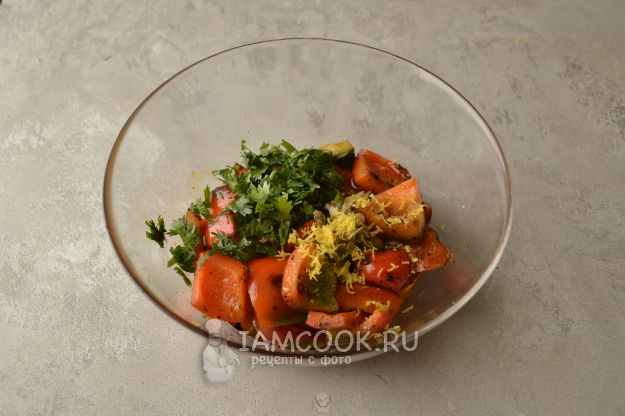 Добавьте в салатник цедру лимона и мелко нарезанную кинзу.
