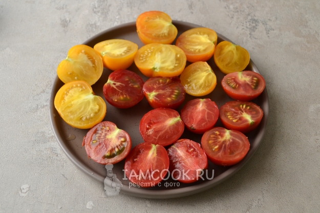 Маленькие помидоры вымойте и разрежьте пополам. Можно использовать черри.