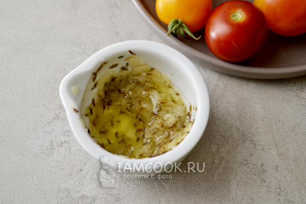 В сковороду, на которой обжаривались овощи, перелейте остатки чесночного масла с зирой, влейте лимонный сок и прогрейте заливку полминуты.