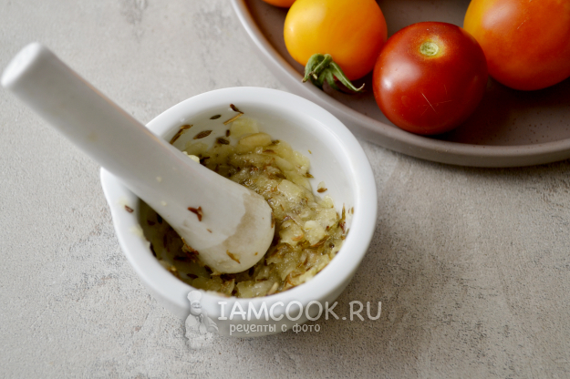 Добавьте в ступку соль и зиру.