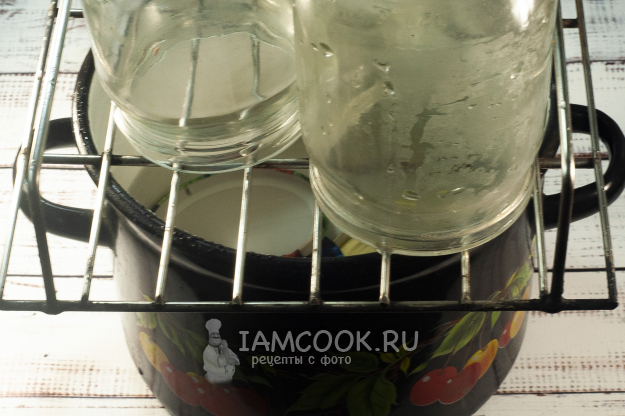 А поверх кастрюли с крышками установим решетку и на решетку выложим банки. Поставим на огонь, подождем, пока вода закипит. С момента закипания воды стерилизуем полулитровые банки 10-12 минут.