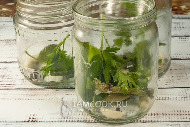 Приступаем к наполнению банок. На дно выкладываем перец горошком, перец душистый, листья хрена (небольшой кусочек листа), листья смородины (1-2 штуки на полулитровую банку), чеснок (1-2 зубца на банку).