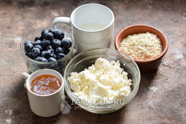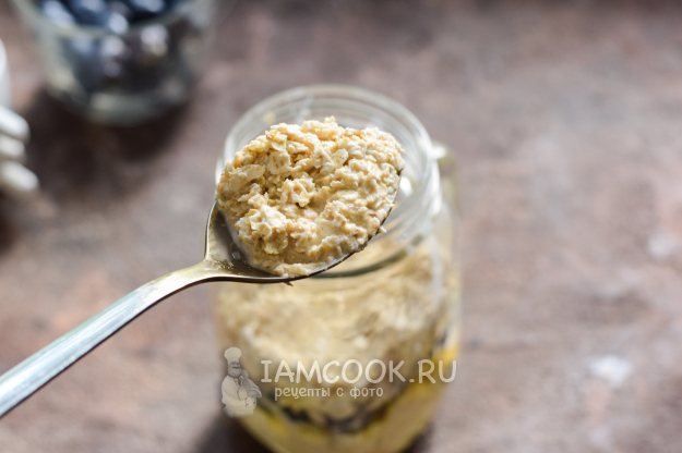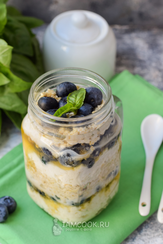 Возьмите все продукты для приготовления ленивой овсянки с творогом в банке по списку.