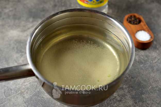 Теперь слейте воду из банок в сотейник или кастрюлю, добавьте соль и сахар, доведите до кипения. Когда соль с сахаром растворятся, влейте уксус.