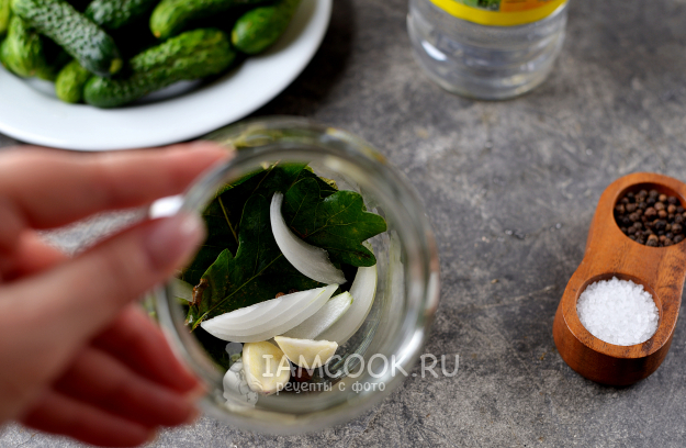 На дно банки положите укроп, листья вишни и дубовые, хрен, а также перцы, ломтики лука и чеснока.