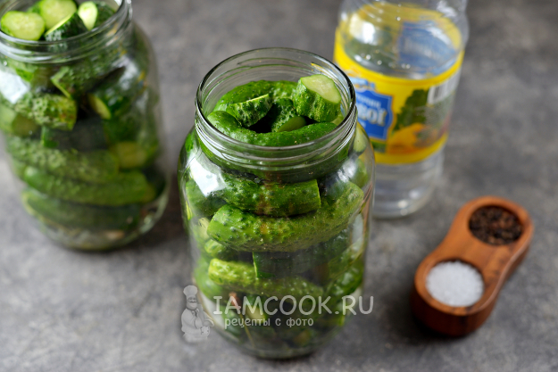 Вскипятите воду в чайнике, залейте банки с огурцами доверху кипятком, прикройте крышками, оставьте на 15 минут. Если боитесь, что огурцы могут "забухтеть", тогда повторите эту процедуру дважды.