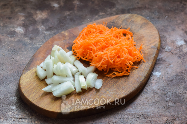 Очистить лук и морковь, овощи вымыть и просушить. Нарезать лук небольшими кубиками, морковь натереть на мелкой терке.