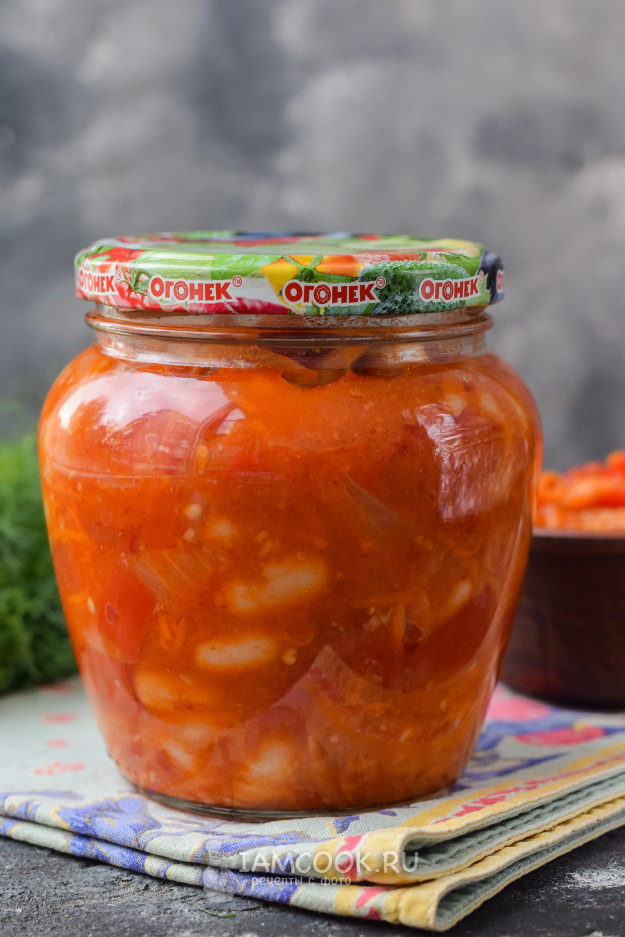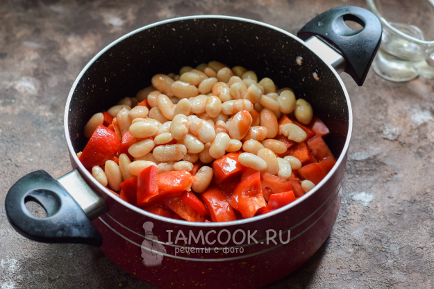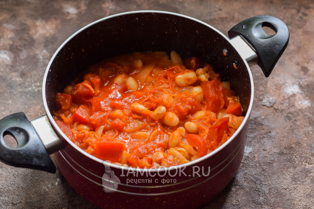 Сложить все ингредиенты в кастрюлю, добавить заранее сваренную фасоль, влить томат, масло, добавить соль и сахар.