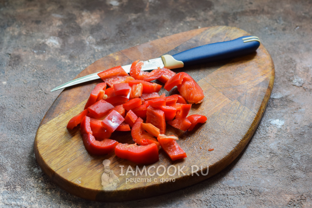 Сладкий перец очистить от семян и удалить перегородки. Нарезать перец небольшими кусочками.