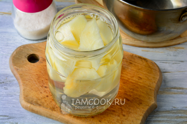Залейте дыню горячей водой, заполняя банку почти до края.