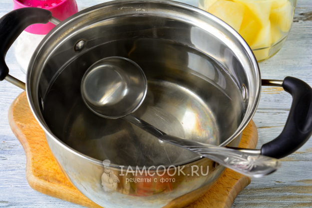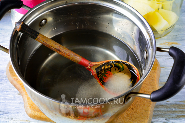Наденьте на банку крышку с отверстиями и слейте жидкость обратно в кастрюлю. Всыпьте сахар и вскипятите. Размешайте, чтобы кристаллы растворились.