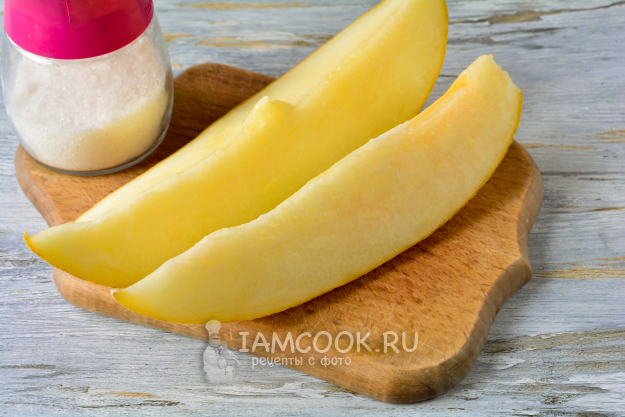 Дыню нарежьте ломтиками, удаляя семена. Нарежьте ягоду крупными кусочками.