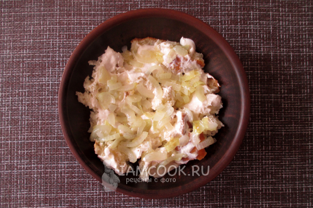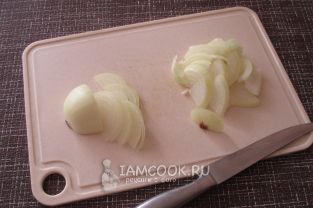 Половину лука тонко нашинкуйте, а вторую половину нарежьте покрупнее и потомите на сливочном масле до прозрачности, слегка посолите.