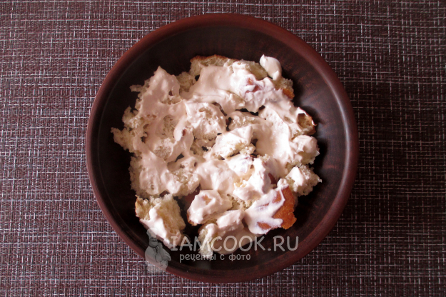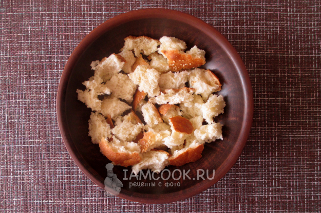 Лепешку поломайте на небольшие кусочки и уложите в миску (деревянную, керамическую или... любую какая нравится).