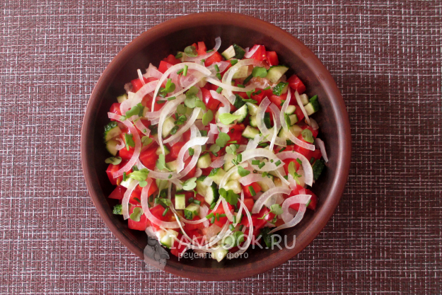 Затем добавьте кусочки помидоров, ломтики огурцов и тонко нашинкованный лук. Посыпьте свежей рубленой зеленью. У меня – микрозелень и зеленое перо лука.