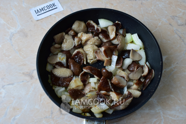 Грибы обжарьте с мелко нарезанным луком в течение 4-5 минут. Подсолите.