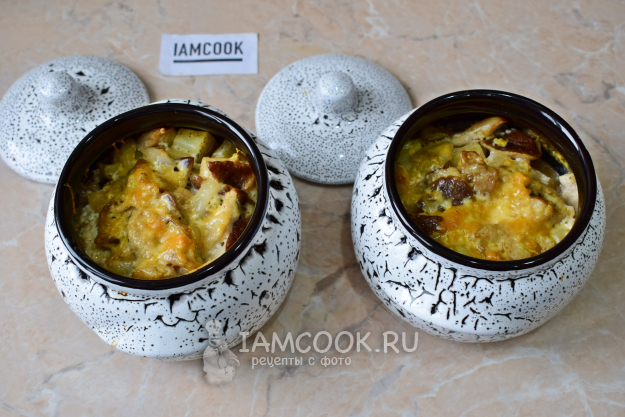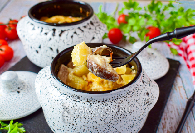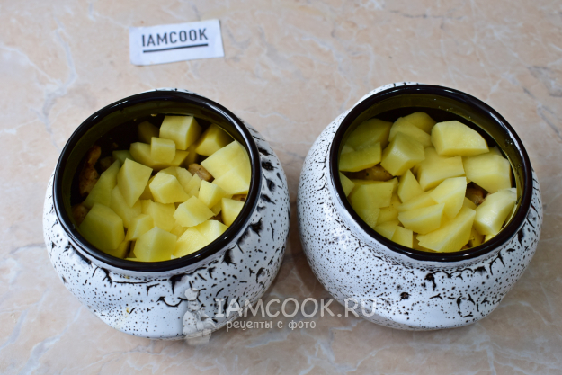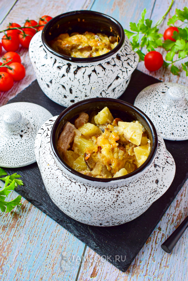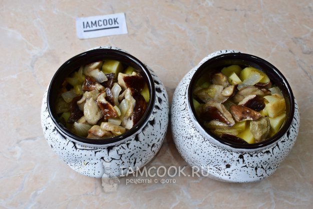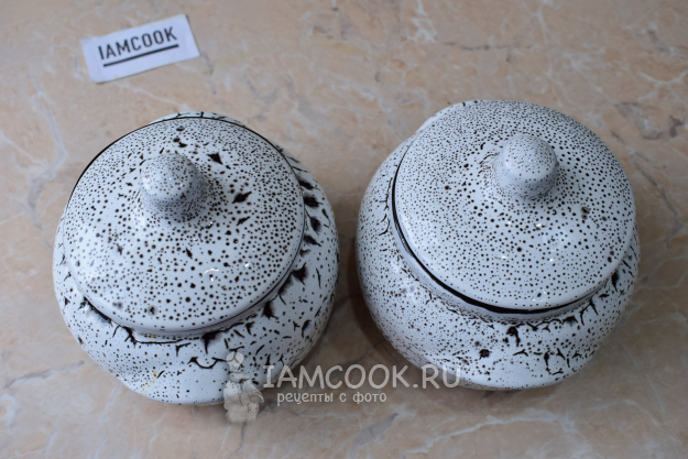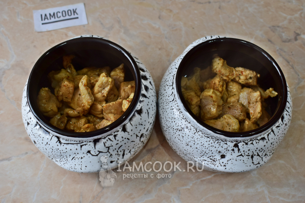 Закройте горшочки крышками и поставьте в холодную духовку. Включите её на 190 градусов и оставьте на 1 час. Керамические горшочки нельзя ставить в горячую духовку, так как от перепада температуры они могут треснуть. Горшочки должны нагреваться вместе с духовкой.